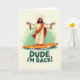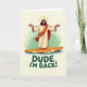 This design shows a long-haired, bearded spiritual figure standing with arms open wide, as if offering a gentle welcome like an old friend 🌷. A soft golden halo glows behind the head against a creamy background, giving the scene a calm, glowing focus. The figure balances on an orange surfboard, gliding over stylized blue-and-white waves that curl like painted ribbons. A cream tunic flows in the sea breeze, and an orange sash drapes over one shoulder, adding a warm accent that feels like a tender touch in the middle of the motion 🐇. In the distance, a light green wash suggests a shoreline, keeping the setting airy and open. Near the bottom, a short casual message appears in dark green lettering, centered and easy to read. The orange surfboard sits diagonally above the text, with foamy wave crests breaking along its lower edge.