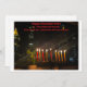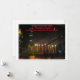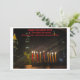 La imagen representa una tarjeta Hanukkah con un paisaje urbano nocturno con una menorah iluminada en primer plano. La menorah tiene nueve velas, todas encendidas, que simbolizan las ocho noches de Hanukkah. La tarjeta incluye el mensaje "Happy, Healthy Hanukkah 2024" y puedes personalizar el texto!