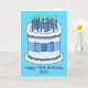 A simple illustration of a white and blue birthday cake, which is decorated with lit candles and a blue bow tied around it The image is accompanied by the words 'Happy 70th Birthday Nate'. The image s set against a turquoise colored background.
