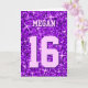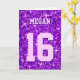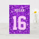 Tarjeta de felicitación con un diseño moderno impreso con estrellas diseminadas sobre un estilizado fondo de "secuin look" y su elección de nombre y edad escrito en tonos morados y lilas. Un diseño de personalizable para que puedas personalizar con tu propio texto, imágenes e ideas. Tenga en cuenta que esta es una imagen de arte digital impresa. El producto no brilla ni contiene purpurinas o secuencias reales.