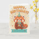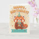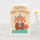 Celebrate a special birthday with this adorable Red Panda illustration! This 5x7 greeting card features a charming red panda wearing a party hat and holding a gift box, set against a whimsical background with festive confetti and stars.