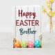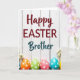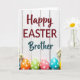 This card features a seasonal greeting set on a rustic background of distressed white wooden planks with vertical lines that add gentle texture. Across the upper area, the word “Happy” appears in deep crimson, written in flowing cursive, leading into “EASTER” in matching crimson, all in large capital letters. Just beneath, “Brother” is placed in a darker teal cursive, giving the layout a friendly, close-knit feel, like a warm note meant for someone you’re glad to have around. Along the bottom edge sits a neat row of egg shapes, each decorated with small white polka dots and filled with bright colors like orange, lime green, soft pink, sky blue, and lemon yellow 🐰. Small clusters of tiny white, daisy-like flowers tuck in near the eggs, adding a gentle spring touch 🌷. The spacing between the words and the decorations feels balanced, as if the message and the gift-like details are leaning toward each other in a soft, affectionate way. The eggs line up across the base with the flowers peeking around them against the pale wood backdrop.