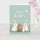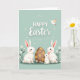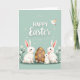 This card shows three fluffy white rabbits gathered close in a patch of green grass dotted with small white daisies 🌷. Two larger rabbits stand on either side of a large egg-shaped treat, their bodies angled inward as if sharing a quiet, affectionate moment together. A smaller rabbit leans snugly against one of the adults, with blush-pink touches on cheeks and inner ears that make the cuddle feel extra tender 🐰. Centered near the top, the text reads “HAPPY Easter” in white, with “HAPPY” in smaller letters above “Easter.” The words sit inside a thin dotted oval that’s decorated with tiny flower accents, all kept light against the background. In the upper right, a small white bird glides by with soft peach and orange shading on its wings. The egg in the middle is deep brown with bright yellow floral patterns, set against a muted aqua sky behind the scene.