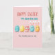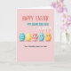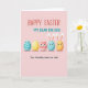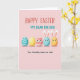 This greeting card features a muted rose background with five egg-shaped figures lined up across the center, creating a sweet, friendly scene 🌷. The first egg is soft blue with teal horizontal stripes, followed by a smooth, sunny yellow egg that feels like a calm pause in the row. In the middle sits a pale pink egg with lighter pink bands and a tiny face, where dot eyes and a small smile suggest a gentle, affectionate greeting. Next come two egg-shaped bunnies—one pastel blue and one bright yellow—each topped with tall white ears with light pink inner details 🐰. Their closed V-shaped eyes and faint pink cheek blush make them look shyly amused, as if they’re sharing a private joke together. Near the top, the phrase “HAPPY EASTER MY DEAR FRIEND” appears in a casual handwritten look, with “HAPPY EASTER” in rich red and “MY DEAR FRIEND” in teal. Along the bottom, “Your friendship makes me smile” is centered in small black lettering beneath the row of eggs.