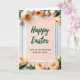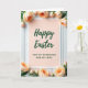 This card sits centered against a vertically paneled white wooden background, giving the scene a calm, homey setting. A slim white border frames a soft peach-pink card, and the gentle color feels like a quiet embrace between loved ones. Across the upper middle, the words “Happy Easter” appear in dark green, flowing lettering, standing out clearly on the warm background 🌷. Beneath that, a smaller line reads “FOR MY GRANDSON AND HIS WIFE” in a neat, simple type style, placed toward the lower center in the same deep green. Around the edges, peach-colored blossoms and closed buds with fresh green stems are arranged like a tender ring, as if softly surrounding the couple named in the message. The flowers’ placement feels affectionate and close, with petals and stems leaning inward toward the text like a shared glance. Soft, diffused light smooths the scene, and the painted wood grain remains visible behind the card while the blossoms show layered petals and tightly curled buds 🐇.