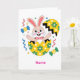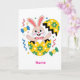 A super fun and festive illustration of a cute bunny with a bow tie popping out of a yellow floral egg, surrounded by colorful candies and confetti. This joyful design is perfect for kids' Easter party favors, laptop stickers, and festive magnets. Celebrate the holiday with a burst of color and sweetness!