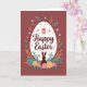 This design shows an off-white egg shape centered on a deep, earthy reddish-brown background, giving the scene a cozy springtime setting. Inside the egg, the words “Happy Easter” sit across the middle in dark crimson lettering that curves smoothly like a gentle handwritten note. Around the egg, a leafy wreath wraps in a near-circle, mixing soft teal, sage green, and warm ochre leaves with small blossoms in coral, peach, and soft pink, like flowers leaning in close 🌷. A smaller patterned egg perches at the top edge of the main egg, colored with an abstract reddish-orange motif that adds a festive accent. Near the lower portion of the white egg, a dark long-eared bunny silhouette 🐇 stands quietly, as if keeping watch with a tender, companionable calm. Tiny coral dots are sprinkled across the white surface, adding light decoration without crowding the central message. The layered leaves and petals look slightly raised against the smooth egg, with the bunny shape grounded at the bottom and the small patterned egg perched above.