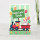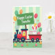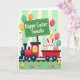 This card shows a small red-and-navy train rolling along a track through a pastel spring scene, with a fluffy yellow chick leaning out of the engine window as if greeting someone special. In the open wagon behind it, two white long-eared bunnies 🐰 sit close together with rosy cheeks, their gentle sideways glance suggesting friendship or romance. Around them are decorated egg shapes in mixed patterns and colors, tucked in like little treasures beside them. Near the top, a framed green sign holds the words “Happy Easter Sweetie” in flowing white lettering, centered and easy to spot. The background is filled with soft vertical stripes in cream and light green, keeping the scene light and airy. Balloons in yellow, red, orange, and teal float upward, some with dots and simple patterns, adding movement above the train 🐇. Along the bottom, a bright green field is sprinkled with more patterned eggs and tiny round candy-like dots.