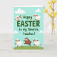 Made to share a spring holiday scene set against a pale blue sky, where five cartoon sheep with soft, fluffy coats and gentle faces gather around a friendly message. In the center, the words “Happy EASTER to my favorite teacher!” sit large and easy to read in rich green lettering. One sheep springs near the top left as if showing off for a friend, while another perches on a letter at the upper right with a fond, steady gaze. Along the bottom, three more sheep romp across a rolling green hill, including one in a warm brown tone beside two white companions, leaning close like a small group of pals. Four rounded white clouds float across the background, keeping the scene airy and light. Tiny flower shapes dot the foreground like early blooms 🌷, adding a gentle seasonal touch alongside the cheerful animals 🐰. The green hill curves along the lower edge with small floral accents sprinkled near the grass line.