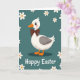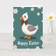 Designed with a stylized white waterfowl—somewhere between a duck and a goose—set against a calm teal background, this card keeps the scene simple and sweet 🐇. Soft gray accents shape the wings, while round, wide eyes and a faint blush on the cheeks give the character a tender, friendly look. A small brown bow tie sits neatly at the neck, adding a touch of dress-up charm without feeling formal. The beak and webbed feet are a warm orange, bringing a cozy contrast that feels like a gentle invitation to share the moment. White daisy-like flowers with yellow-orange centers drift around the bird, like a loose spring wreath 🌷. Along the bottom, the words “Happy Easter” appear centered in rounded white lettering, standing out clearly against the teal. Several blossoms float near the lower edge, with a few petals angled inward toward the text.