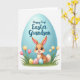 This greeting card shows a light brown bunny with big, gentle eyes and a small smile, sitting low in a tuft of spring-green grass with its fluffy white tail peeking out 🐰. Near its paws, three decorated eggs add a sweet, friendly touch, including one sunny yellow, one with pink dots, and one with tiny blue speckles. A large soft blue oval backdrop wraps the scene, giving it a calm, cozy setting that feels like a quiet moment shared with family. Across the upper area of the oval, the message “Happy First Easter Grandson” appears in flowing cursive-style lettering in a darker blue for easy contrast. On both sides of the bunny, small tulip bouquets lean inward as if they’re gathering close, with petals in gentle pinks and warm yellows 🌷. The lighting is even and soft, bringing out fine whiskers, rounded cheeks, and the tender way the bunny seems to look forward with affectionate curiosity. The edges of the blue oval fade slightly with a light gradient, while the grass blades and egg patterns stay crisp against the smooth background.