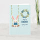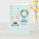 This design shows a sweet illustrated bunny sitting on a wooden swing against a light blue background, with a tender little smile that feels like it’s meant for someone close 🐰. The bunny has soft white fur, pink-lined ears, rosy cheeks, and wears a blue tunic with narrow horizontal stripes, giving it a gentle, friendly look. The swing hangs from two rope lines, and the ropes are wrapped with small white and yellow flowers and thin green vines, like a spring garland. Off to the upper right, a round floral wreath adds a romantic, caring touch, mixing blue, white, and yellow blooms with leafy green sprigs 🌷. Inside the wreath, the text “Happy 1st EASTER” sits prominently in blue near the top, with “Great Grandson” placed beneath it in a flowing, cursive-style blue lettering. A faint pale-blue grid pattern spans the background, adding light texture without distracting from the main scene. The wreath’s circular shape and the swing’s curved seat stand out against the soft grid, with blossoms clustered along the ropes and around the wreath edge.