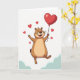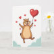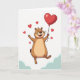 This Valentine’s Day greeting card features a chubby, groundhog-like character floating happily in the air. The character has light brown fur with a darker outline, wide joyful eyes, and a big smile with a tiny pink tongue showing. One arm stretches outward while the other holds a thin string tied to a shiny red heart-shaped balloon drifting near the top of the card. Several smaller red hearts float around the character, adding a sweet romantic touch ❤️💌. The background is bright white with a soft hint of pale blue clouds along the bottom edge, giving the scene a light, uplifting feel. There is no text on the front, letting the artwork speak for itself. It’s a cheerful, caring card that’s perfect for sharing Valentine’s Day love with someone special
