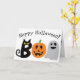 The Happy Halloween! greeting card features a playful, cute design. The design includes the word "Boo" with the letters made from a black cat, a pumpkin, and a ghost. The card also features curved text above the word "Boo", which says, "Happy Halloween!"
