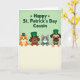 Designed with soft green tones, this digital illustration shows four friendly animal characters lined up across the middle, leaning close together like pals sharing a quiet laugh 💚. An orange cat, a brown dog, a gray cat, and a tan-faced dog peek over a wide cream banner at the bottom, their paws resting along the top edge as if they’re inviting you in. Their big eyes and gentle smiles suggest easy affection and a cozy, companionable mood. Two of them wear green top hats—one with a gold buckle—while the other two sport neat green bow ties, adding a festive touch ☘️. Near the top, an emerald-green holiday greeting is set in thick, easy-to-read letters, with small shamrock shapes tucked around the words. The background fades from pale lime green to a lighter green glow, keeping the scene soft and airy. The cream banner below is left blank for your own note, contrasting clearly against the green backdrop. Tiny shamrock accents sit near the headline, and the hats and bow ties match the same deep green used in the text.