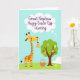 This design shows a tall, spotted, long‑necked animal on the left, colored sunny yellow with warm orange and brown markings, leaning in with a tender, friendly look as it holds a striped pastel egg gently in its mouth 🐰. On the right stands a stylized tree with a sturdy brown trunk and a rounded green canopy, creating a cozy gathering spot. Across the bright green grass and hanging from the branches are many decorated eggs, featuring dots, swirls, and stripes in soft lavender, coral, and light blue. A woven basket sits at the base of the tree, tipped slightly open and filled with more patterned eggs, as if they’ve been collected together. Near the top, a white thought bubble contains the greeting text in purple, placed centrally so it floats above the scene. The flat, airy shapes and soft colors give the picture a gentle springtime mood, like two friends sharing a quiet moment during an egg hunt 🌷. The eggs are spaced in a loose trail from the basket outward, and a few hang at different heights from the tree’s branches.