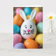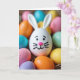 Designed with a close-up view of an egg-shaped bunny figure, the scene centers on a smooth white character with upright ears and a sweet, friendly expression 🐰. Its face shows a bright pink button nose, fine black whiskers, a wide curved smile, and two wide-set eyes that seem to gaze warmly at the colorful eggs around it. Nestled tightly beside it are glossy eggs in sunny yellow, sky blue, soft lavender, cheerful orange, and gentle pink, with a few dotted with tiny speckles for extra texture. The background is filled with straw-like strands that add a cozy, rustic setting, as if the little bunny has settled into a shared nest with its companions 🌷. Soft light glides across the shells, bringing out small highlights and reflections that make the group feel close and companionable. Near the top, a short greeting sits in small, light-colored letters that stand out gently against the blurred background. The surrounding eggs fade slightly out of focus toward the edges, while the white bunny-egg stays sharp at the center with its pink nose and black whiskers clearly defined.