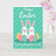 This card shows two stylized white bunnies 🐰 standing side by side in the center, their tall ears softly lined with pink as they smile with tiny dot eyes and fine whiskers. Their close, mirrored poses suggest an easy closeness, like a couple or close friends sharing a quiet moment together. Around them sit five decorated egg shapes, each filled with stripes or dots in sunny yellow, soft rose, and cool aqua tones. The background is a teal-aqua field with faint diagonal stripes in a lighter shade, adding gentle movement without crowding the scene. Near the top, the words “Happy Easter” appear in flowing white lettering with a subtle shadow that helps it stand out. Near the bottom, “Son and Daughter in Law” is written in matching white lettering, centered beneath the bunnies, with a small 🌷 accent nearby. The eggs are positioned to the left and right of the pair, balancing the layout against the teal striped backdrop.