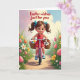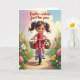Designed with a cheerful spring scene, this Easter card features a young girl with bright eyes and rosy cheeks riding a slender pink bicycle along a sunlit dirt path. Her brown hair is styled in pigtails tied with two big blue bows, and she wears a red sleeveless outfit that stands out against the garden greens. Two wicker baskets hang from the handlebars, one filled with decorated eggs and the other holding a small brown-and-white puppy in a blue neckerchief, leaning close as if enjoying the ride together 🐰. Around them, green grass and tiny white-and-yellow flowers line the path, while oversized patterned eggs in pinks and oranges rise on thin stems like garden blooms 🌷. A simple Easter greeting sits near the top in a soft, light-colored font, with smaller text tucked neatly near the bottom in a matching shade. The sky shifts from gentle lavender on the left to clear blue on the right, dotted with a few pale clouds. Oversized eggs with polka dots and stripes appear among the flowers in pink, orange, and peach tones.