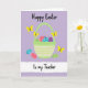 This design shows a light green basket with horizontal stripes and a gently arched handle, set against a soft lavender background 🌷. Inside the basket, oval seasonal tokens in coral, teal, sage, and deep purple sit close together like friends leaning in, each decorated with tiny crosses, dots, and hearts. A few of the ovals tumble out and rest below the basket, creating a casual, shared-moment feel, like someone just set them down for another person to find 🐰. Four small yellow winged insects hover above with antennae raised, circling the basket as if drawn to the sweet scene. The words “Happy Easter” appear near the top in black, loose hand-drawn lettering, standing out clearly on the lavender field. Along the bottom, a wide white textured band stretches across the card with “to my Teacher” written in black and centered within it. The lower band looks slightly grainy, like brushed paper, with the basket and scattered ovals sitting just above its edge.