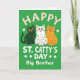 This greeting card shows three stylized cats lined up side by side on a rich emerald green background, their bodies dotted with green polka dots that echo the festive theme 💚. A sleek black cat, a bright white cat, and an orange tabby lean close as if posing together, their yellow eyes turned forward with a friendly, affectionate look. Small white shamrocks float around them like confetti, filling the space without crowding the trio ☘️. Near the top, the word “HAPPY” sits in soft cream letters, centered above their ears. Under the cats, “ST. CATTY’S DAY” appears in matching cream text, arranged as a clear, cheeky headline. At the very bottom, “Big Brother” is written in smaller cream lettering, tucked neatly beneath the main message. The black cat adds a tiny pink tongue peeking out, and all three have little pink smiles against the green field.