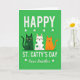 This greeting card features a bright emerald green background that sets a festive St. Patrick’s Day scene with a friendly, close-knit feel 💚. Three stylized cats sit in a neat row across the center, as if posing together for a shared moment. The left cat is deep forest green, the middle cat is white with two green polka dots, and the right cat is tangerine orange, all with wide yellow eyes and tiny open smiles showing a touch of pink. Their matching expressions and snug spacing make them look like loyal pals enjoying the day side by side ☘️. Near the top, “HAPPY” appears in white sans-serif letters, with small shamrocks tucked in as extra accents. Below the cats, “ST. CATTY’S DAY” is written in white and centered, keeping the joke front and center. Near the bottom, “Dear Brother” appears in white cursive-style lettering with little shamrocks on either side, all set against the flat green field.
