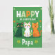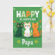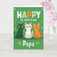 This card shows three cartoon cats lined up on a deep emerald green background, close enough that their rosy cheeks and bright yellow eyes seem to meet in a friendly, affectionate glance 💚. On the left sits a forest-green cat, in the middle a white cat sprinkled with lime-green spots, and on the right an orange tabby marked with warmer red-orange patches. Each cat has fine whiskers and a soft blush, giving them an easy, companionable look that feels like they’re sharing the holiday together. Across the top, the phrase “HAPPY ST. CATTY’S DAY” is set in big uppercase letters, with “HAPPY” shifting from white to spring green to orange. Small four-leaf clovers in mixed greens and a few orange accents float around the cats, with little starburst shapes scattered between them ☘️. Near the bottom, “Papa” appears in white, centered beneath the trio like a neat name tag. The overall style is flat and graphic, with simple shapes and sharp edges that keep the cats and clovers crisp against the solid green field. Around the cats, the clovers and starbursts are spaced like confetti, dotting the background from top to bottom.
