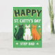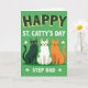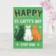 This design shows three stylized cats sitting side by side on an electric green background, leaning slightly toward one another as if sharing a friendly, inside joke 💚. On the left is a dark emerald cat, in the middle a white cat with lime-green polka dots, and on the right a ginger cat that warms up the lineup with its sunny coloring. Their wide eyes and small smiles, paired with fine whiskers, give them a tender, companionable look, like they’re posing for a photo together. Across the top, the word “HAPPY” appears in dark green letters with a gold shadow, set in a chunky, 3D style that pops from the background. Just beneath it, “ST. CATTY’S DAY” is written in crisp white, centered above the cats and easy to read ☘️. Near the bottom, “STEP DAD” is printed in white and flanked by small four-leaf shamrocks that act like little brackets. A deeper green oval sits under their paws, grounding the trio like a simple stage.