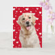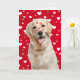 Golden retriever dog with red lipstick kisses on a red background with a white heart design.