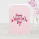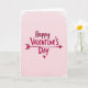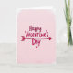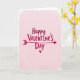 This greeting card centers on the words “Happy Valentine’s Day” written large in red across the middle. The letters look hand-drawn and flowing, giving the message a gentle, close-to-the-heart feel ❤️. A thin red arrow runs straight through the word “Valentine’s,” stretching from left to right like Cupid’s shot. Small red hearts add sweet details, with one used as the dot over the “i” and another tucked just under the word “Day.” The background is a muted blush pink with a light, paper-like texture and a few tiny specks scattered around. The red text and arrow stand out clearly against the soft pink, keeping the focus on love and connection. It feels meaningful because it says what you want to say without needing anything extra, whether you’re giving it to a partner or a close friend 🥰.