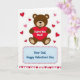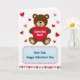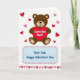 This greeting card shows a cute cartoon teddy bear with warm brown fur and a gentle, friendly expression near the top. The bear hugs a large red heart, and on the heart the text “I Love You Dad!” appears in simple white letters that stand out clearly. Around the bear, several small red and pink hearts float on a plain white background, adding a sweet Valentine’s Day feel ❤️. Below the bear, there’s a light blue rectangle outlined with a dashed red border. Inside that box, the message “Dear Dad, Happy Valentine’s Day,” is written in deep blue, easy-to-read letters. Along the bottom edge, a row of alternating red and pink hearts forms a neat border that ties the whole design together. It feels meaningful because it’s straightforward and affectionate, making it easy to tell Dad you care without overthinking it 🥰.
