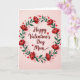 This Valentine's Day card shows the words “Happy Valentine’s Day Mom” in deep crimson, written in flowing cursive across the center. A round wreath of rich green leaves surrounds the message, dotted with layered red flowers that have tiny white centers. The background is a soft blush pink, which makes the reds and greens stand out without feeling loud. Small red hearts are scattered around the wreath, and they look like they’re gently floating near the text. Light shading gives the flowers, leaves, and hearts a bit of depth, so the design feels warm and thoughtful. It comes across as a simple, sincere way to tell your mom you love her and appreciate her 🥰. The mix of flowers and hearts keeps it sweet and romantic while still feeling caring and family-focused ❤️.