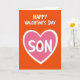 This card shows a bright orange background with a large pink heart in the middle, outlined in white. Across the top, the text “HAPPY VALENTINE’S DAY” is written in white, with a casual hand-drawn look, and it sits above the heart. Inside the heart, the word “SON” appears in white, centered and easy to read. The “O” is replaced by a small dark red heart, which adds a sweet little detail ❤️. The simple shapes and strong colors make the message feel direct and sincere, without needing extra decoration. It feels meaningful to give because it clearly says “I love you” in a way that’s warm and straightforward, especially for a son. Share it to send a little extra care and closeness on Valentine’s Day 🥰.