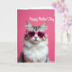 This card shows a fluffy long-haired cat centered in the design, staring forward with a calm, slightly serious look that feels oddly affectionate. Heart-shaped glasses in a bright pink tone sit on its face, adding a sweet, friendly wink of romance ❤️. The fur mixes silvery gray tabby markings with a big white mane around the cheeks and chest, giving the portrait a soft, cozy contrast. Behind the cat is a solid fuchsia background that keeps the focus tight and makes the glasses stand out. Near the top, the words “Happy Mother’s Day” appear in white flowing lettering, easy to spot against the pink. A thin white border with a lightly sketched texture frames the scene, like a gentle outline around a photo. Soft lighting smooths the background while catching tiny highlights on the glasses and the cat’s fur 🌼. The heart-shaped lenses are glossy fuchsia, matching the background while staying clearly defined around the cat’s eyes.