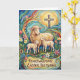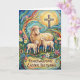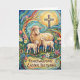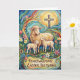 This sweet Easter card features a colorful painting of a mother sheep with two lambs nestled close, surrounded by bright spring flowers with a cross gently rising in the background. The artwork captures warmth, protection, and tender love, making it a beautiful symbol of the care God has for the one you cherish. With “Heartwarming Easter Blessings” on the front and a message inside about the Savior’s comforting nearness and peace, this card is perfect for anyone who needs a gentle reminder that they are safely held in His arms. It is an ideal choice when you want your Easter greeting to feel both visually delightful and deeply encouraging.