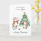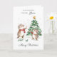This design features a watercolor illustration of joyful hedgehogs in front of the Christmas tree.