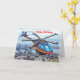 Tarjeta Helicóptero volador alto sobre la ciudad feliz cum