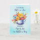 Esta deliciosa tarjeta del Día de la Madre es la manera perfecta de celebrar a su cuñada. La tarjeta, que cuenta con una bonita taza de té con flores frescas y un suave fondo de color azul, está diseñada para alegrar su día. Con el alegre saludo frontal, "Una Copa de Alegría en el Día de la Madre", y un cálido mensaje en el interior, es una hermosa manera de mostrarle cuánto es valorada y admirada.
