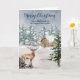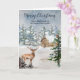 Feliz Navidad para su hermana y su tarjeta familiar con una rústica cabaña de acuarela de invierno en un bosque nevado y ciervo.