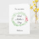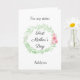 Una tarjeta de hermana para el primer día de la madre con acuarela verde de laurel y flores rosadas, que podrás personalizar fácilmente en la parte frontal con su nombre. El mensaje interior de esta bonita tarjeta del primer día de la madre para hermana dice un mensaje sincero, que también puedes personalizar si lo deseas. La parte trasera tiene el mismo laurel de acuarela con flores rosadas con un lugar para que pongas el nombre del niño y "mami" o lo que quieras. Un dulce recuerdo del día de la madre que es personalizado y seguro que será atesorado.