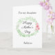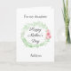 Una tarjeta de hija del Día de la Madre con hermoso laurel de acuarela verde y flores rosadas, que podrás personalizar fácilmente en la parte frontal con su nombre. El mensaje interior de esta bonita tarjeta del Día de la Madre para hija dice un mensaje sincero, que también puedes personalizar si lo deseas. La parte trasera tiene el mismo laurel de acuarela verde con flores rosadas con un espacio para que pongas el nombre de los niños o lo que quieras. Un dulce recuerdo del Día de la Madre que es personalizado y seguro será atesorado.