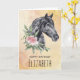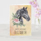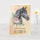 Tarjeta de felicitación de cumpleaños con un hermoso ilustracion de cabeza de caballo negra con un lujoso adorno floral al cuello. Elegante y elegante pintura de animales. El fondo es un diseño abstracto y elegante de un color amarillo claro con faldas de oro falsas.
