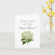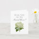 Una tarjeta de presentación para tu criada de honor, esta moderna tarjeta blanca cuenta con un ilustracion antiguo de flores de horangea blanca y verde con un texto clásico y fácil de personalizar que te permite elegir cómo "proponer" a los miembros de tu fiesta nupcial.