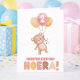 De tekst “Hieperdepiep Hoera!” maakt de kaart extra feestelijk en kindvriendelijk. De leeftijd in de ballon is aanpasbaar, zodat je eenvoudig elke verjaardag kunt vieren, terwijl de illustratie en tekst vast blijven voor een mooi en harmonieus ontwerp.