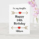 Una tarjeta personalizada de 14 años para su hija, que usted puede personalizar fácilmente el frente de la tarjeta con su nombre. Presenta flechas purpurinoso con corazones. Dentro de esta hija de 14 años se lee un mensaje sincero, que se puede personalizar fácilmente. Esto le haría un recuerdo único de su cumpleaños.