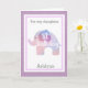 Una tarjeta de hija de primer cumpleaños de elefante morado. Presenta un suave elefante de color morado, que dice "primer cumpleaños". Podrás personalizar la parte delantera de la tarjeta con el nombre de tu hija. El mensaje de la tarjeta interior también se puede personalizar fácilmente. La parte trasera de esta tarjeta de chica de 1 cumpleaños para elefantes tiene el mismo elefante acuático, que podrás personalizar bajo el año. Esto haría un dulce sabor de primer cumpleaños.
