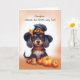 ¡Esta Halloween sorprende a tu querida hija con esta adorable tarjeta! En el interior, un encantador perro negro y marrón, con un divertido gorra de brujas, se alza entre alegres calabazas. El fondo del lavabo de color agua suave aporta un toque de calidez, y la hoja caída del gorra realza la calidez de la tarjeta. Comparte el espíritu de 'Howl-oween' y hazle saber que es una delicia en tu vida.