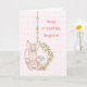 Una tarjeta tan dulce para tu hija. Un conejo de conejo se balancea sobre un columpio de flores lleno de flores. El fondo rosa suave muestra una sutil huella de plástico. ¡Perfecto para celebrar la primera Pascua de su hija!