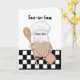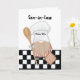 El anverso de la tarjeta de cumpleaños de su yerno muestra un jovial gnomo con una magnífica barba, arbustiva, vestida con el vibrante gorra y delantal del chef. El gnomo está alegremente blandiendo una cuchara de madera en una mano y sosteniendo un portaobjetos en la otra. La carta ofrece un ambiente cálido y acogedor, capturando la esencia de la alegría culinaria y la creatividad.