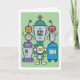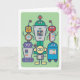 ¡Los robots están aquí! Fomentar una pasión por la ciencia. Un ilustracion divertido de 6 robots con diferentes formas, colores y mirada. Esta tarjeta es una imagen digital de papel pintado a mano. Los colores incluyen pizarra oscura, verde menta, margarita rosada, azul cielo claro, marrón cartón, oro brillante, pergamino, cardo morado, hiedra roja, hiedra azul, aguijón morado, blanco fantasma, naranja oscuro, verde tierra y plata. Interior: En blanco para todas las ocasiones.